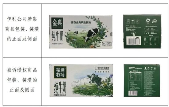 2025年,在二审判决中,法院认为,将蒙牛“精选牧场”包装、装潢与伊利“金典”纯牛奶包装、装潢相比,两者在标识的色彩、样式、位置;文字的字体、色调及位置;插图的颜色及搭配、选择的奶牛、牧场、植物、花朵等元素艺术加工形成的整体图案;包装侧面与正面配合使用一致色调等方面,“均较为接近”,使得两者的整体视觉效果构成近似。对蒙牛上诉不予支持。最终维持一审原判。二审案件受理费约4.78万元,伊利负担1000元,蒙牛负担4.68万元。